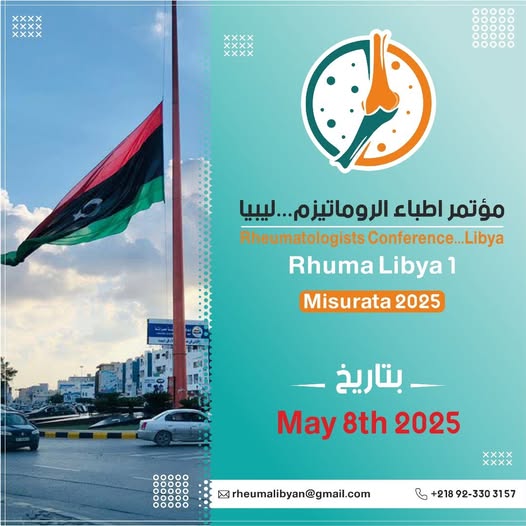 دعما لتخصص الروماتيزم في مدينة مصراتة و المنطقة الوسطى يسعدنا الاعلان عن مؤتمر اطباء الروماتيزم .. ليبيا(Rheuma libya 1) استظافة المعهد القومي لاورام مصراتة و ذلك في يومي 8-9 من شهر مايو القادم . rheumalibyan@gmail.com 0923655920-0926771941