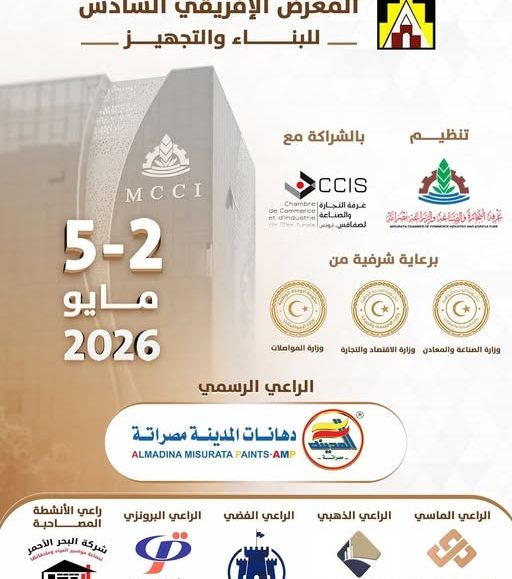 تُعلن غرفة التجارة والصناعة والزراعة مصراتة عن تنظيم ودعوة الشركات والمؤسسات المنتسبة للمشاركة في فاعليات” المعرض الإفريقي السادس للبناء2026 ” في دورته السادسة وذلك بتنظيم مشترك مع غرفة التجارة والصناعة بصفاقس – الجمهورية التونسية 📅 الفترة: من 2 إلى 5...