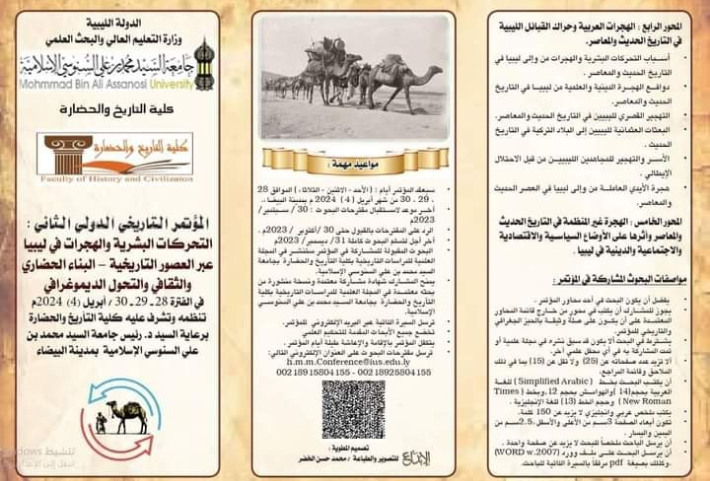 The Second International Historical Conference (Human Movements and Migrations in Libya Through Historical Ages – Civilization and Cultural Building and Demographic Transformation) Al-Sayyid Muhammad bin Ali Al-Senussi Islamic University is pleased to announce the organization of the Second International Historical...