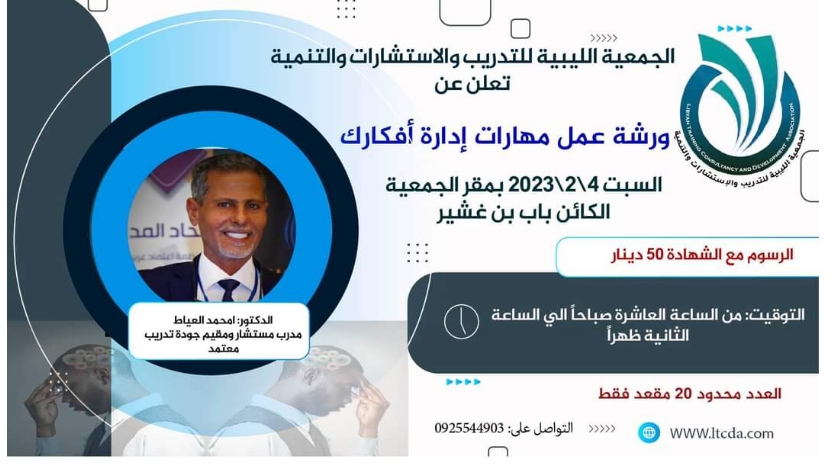 The Libyan Society for Training, Consulting and Development announces a workshop on the skill of managing your thoughts. In fact, more than fifty thousand thoughts come to a person’s mind daily, and usually 70 or 80% of them are negative,...
