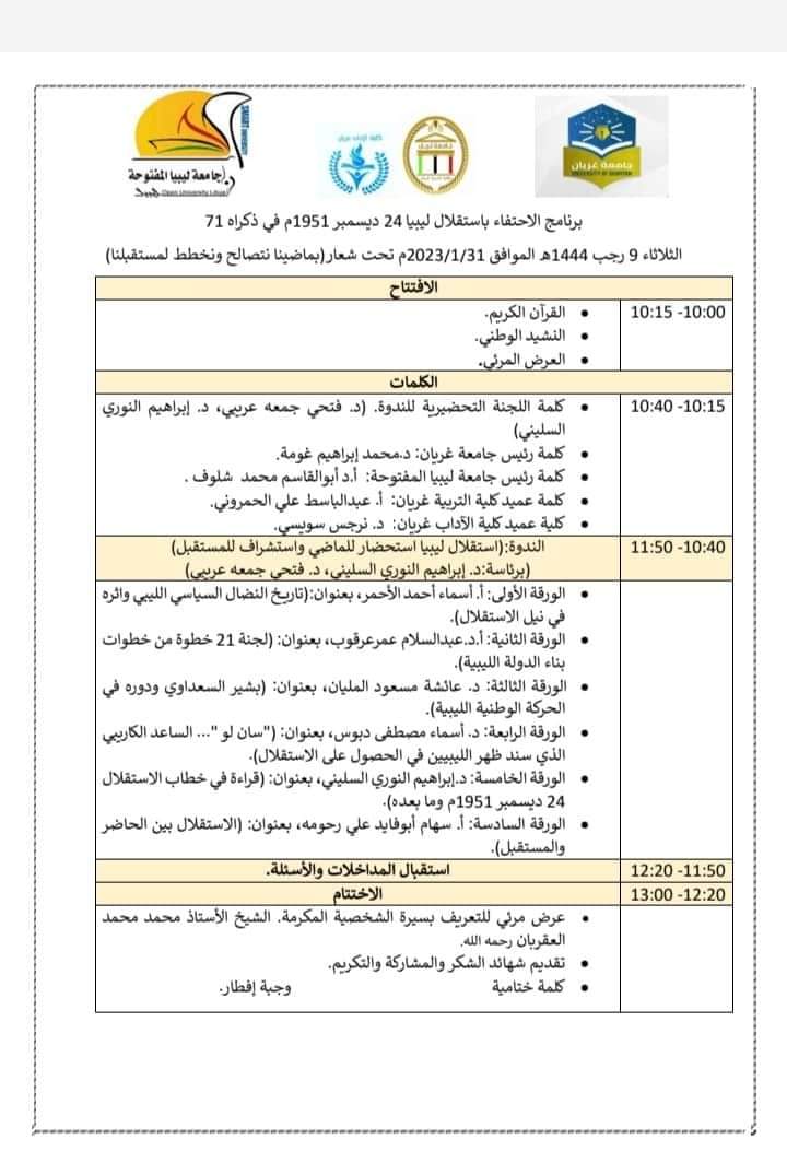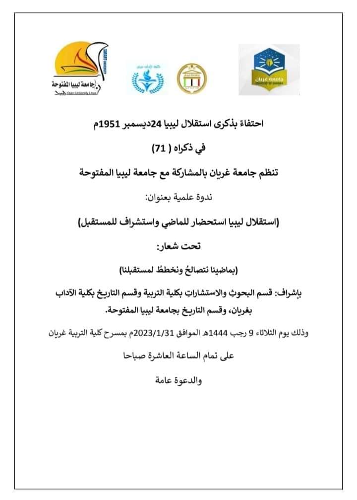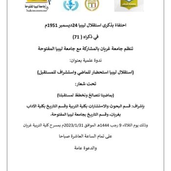 Gharyan University, in partnership with Libya Open University, is organizing a scientific symposium entitled “Libya’s Independence: Recalling the Past and Looking to the Future” under the slogan (With our past, we reconcile and plan for our future), on Tuesday, January 31, 2023, AD, at exactly ten o’clock in the morning, in the theater of the College of Education, Gharyan.