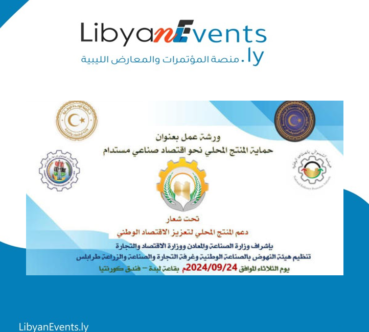 تنظـــــم غـــرفة التجارة و الصناعة و الزراعة طرابلس بالتعاون مع الهيئة الوطنية للنهوض بالصناعة ورشة عمل حول حماية الانتاج الصناعي المحلي و تعزيز قدراته التنافسية و التدابير اللازمة للحد من سياسات الاغراق التي يشهدها السوق الليبي على تمام الساعة العاشرة من صباح يوم الثلاثاء الموافق 24/9/2024 م بقاعة لبــــدة بفنـدق كورنثيا .
