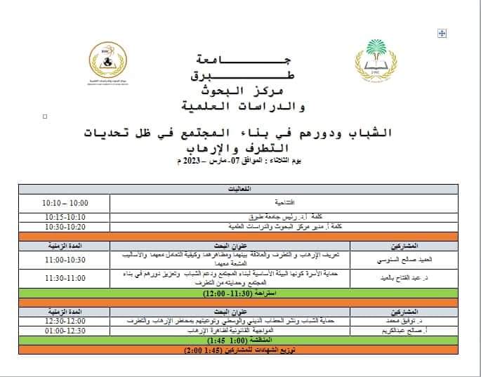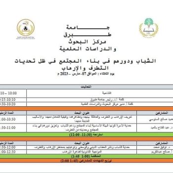 A scientific symposium entitled Youth and their role in building society in light of the challenges of extremism and terrorism ندوة علمية بعنوان الشباب ودورهم في بناء المجتمع في ظل تحديات التطرف والإرهاب