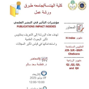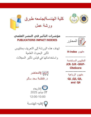 Received by the Vice Dean for Scientific Affairs, Faculty of Engineering, University of Tobruk, Dr. Fatima Saad Salem. It is worth noting that the workshop aims to introduce measures of the impact of scientific research and their uses in measuring the impact of scientific journals, on (Wednesday) corresponding to: 7_6_2023 in the Meetings Office of the College of Engineering at ten in the morning. The target audience is the faculty members of the college.