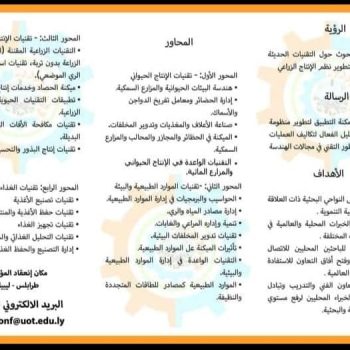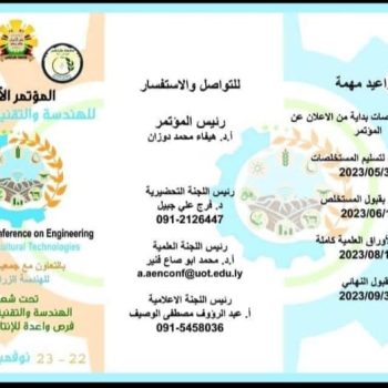The Department of Agricultural Engineering at the Faculty of Agriculture, University of Tripoli, intends to hold the first scientific conference on agricultural technologies, during the period from 22-23 / November / 2023 AD. Thus, the organizing committee of the conference invites all professors, experts, and those interested in agricultural technologies to participate in the conference with scientific papers to enrich its activities.