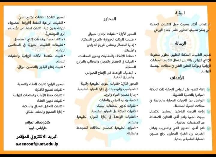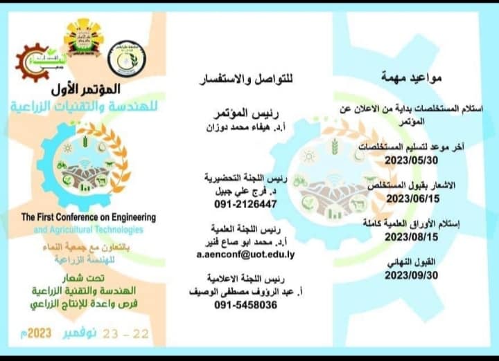 The Department of Agricultural Engineering at the Faculty of Agriculture, University of Tripoli, intends to hold the first scientific conference on agricultural technologies, during the period from 22-23 / November / 2023 AD. Thus, the organizing committee of the conference invites all professors, experts, and those interested in agricultural technologies to participate in the conference with scientific papers to enrich its activities.