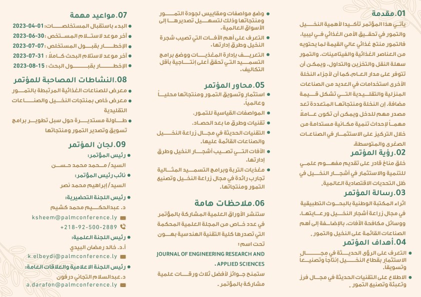 Announcement of the first scientific conference on date palm development in Libya under the slogan (Caring for palm trees for sustainable development), which will be held on 05-06 September 2023 AD in Hun, organized by the Palm Farmers Association in Hun and the College of Agriculture – University of Tripoli, note that the deadline for submitting abstracts is June 30, 2023, and the deadline for receiving full research is July 31, 2023.