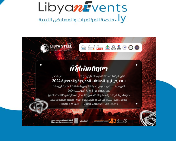 تعلن شركة المسداة لتنظيم المعارض عن فتح باب الحجزبـ #معرض ليبيا للصناعـــــــــــــات الحديدية والمعدنية 2024الذي سيقام بـ معرض مصراتة الدولي بالمنطقة الصناعية الرويساتخلال الفترة من 5 إلى 7 أكتوبر 2024#دعوة لكل الشركات والمصانع المختصة بهذا المجال للمشاركة بهذا الحدث المميز التاريخ: من 5 إلى...