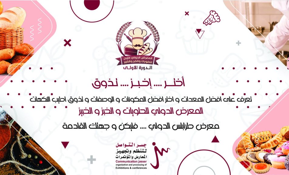 المعرض الدولي الاول للحلويات و الخبز و الخبيز.4 – 6 / 10 / 2022 ملأول مرة على أرض معرض طرابلس الدولي سيقام معرض متخصص في مجال الحلويات و الخبز و الخبيز بمشاركة العديد من الشركات و المعامل المحلية و الدولية...